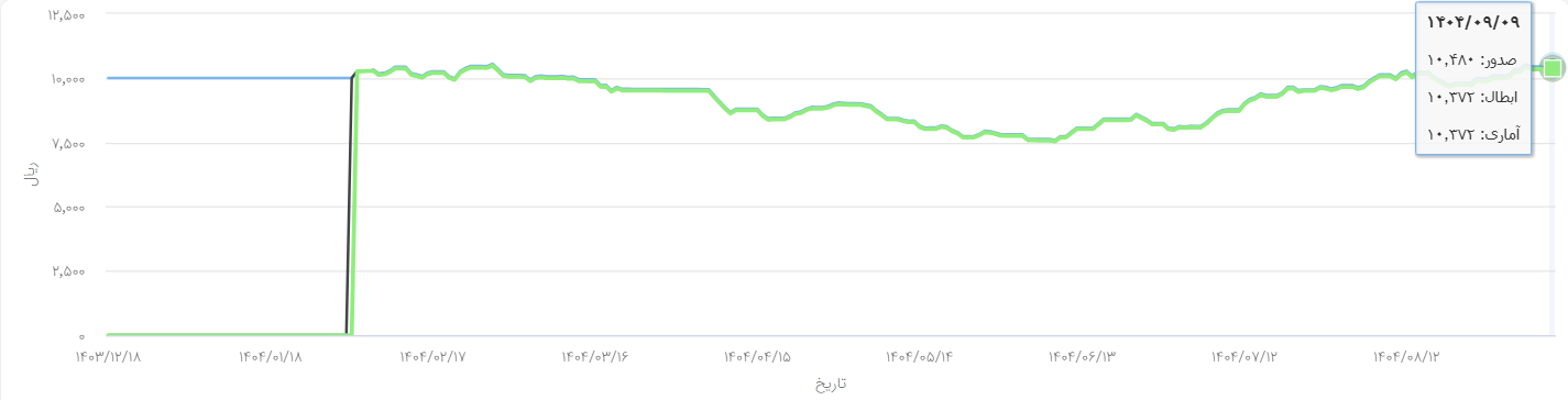 نمودار مقابل بازدهی صندوق شاخصی هوشمند را در مقایسه با شاخص کل بازار نشان میدهد. این نمودار بیانگر توانایی صندوق در دنبال کردن هوشمندانه روند بازار و خلق بازدهی بالاتر با استفاده از استراتژیهای شاخصمحور و مدیریت مبتنی بر الگوریتمهای تحلیلی است.